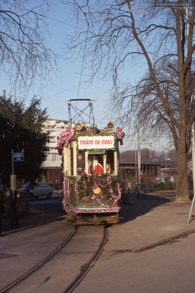 3148(494.42)_AGMT_1974-18_d.jpgImage JpegAssurant une course du "Tram de Noël", l'automotrice 67 de l'AGMT, conduite par le Père Noël, marque l'arrêt à la gare des Eaux-Vives / Jean-Marc Bongni