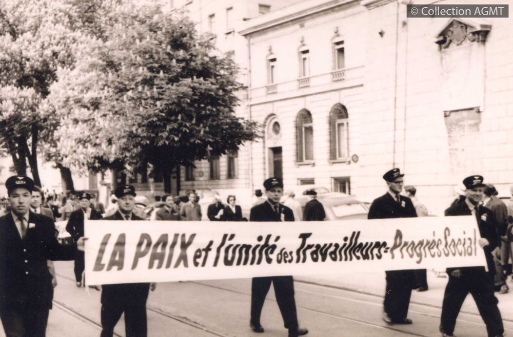 Les employés de la CGTE défilent derrière une banderole portant le slogan "La paix et l'unité des travailleurs = progrès social" [document graphique à deux dimensions] . - [ca 1945] . - 1 photo : noir et blanc ; 10 x 14 cm. Langues : Français ( fre)