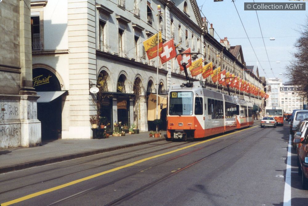 3141(494.42)_TPG_1990-03_d.jpgImage JpegEn service sur la ligne 12 à destination du Bachet, l'automotrice Be 4/6 815 des TPG passe à la place de Neuve où le Cityrunner 857, loué à la ville de Lodz pour assurer le service sur la ligne 13, stationne sur la voie centrale / Jeremy Wiseman