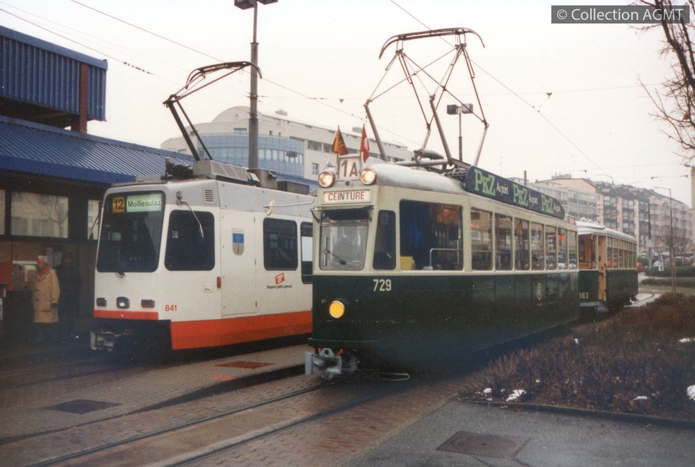 PermalinkAu terminus de la ligne 12 à Moillesulaz, le convoi AGMT formé de l'automotrice Ce 4/4 729 et de la remorque C4i 363 stationne à côté de la Be 4/8 841 des TPG / Gaston Guignard