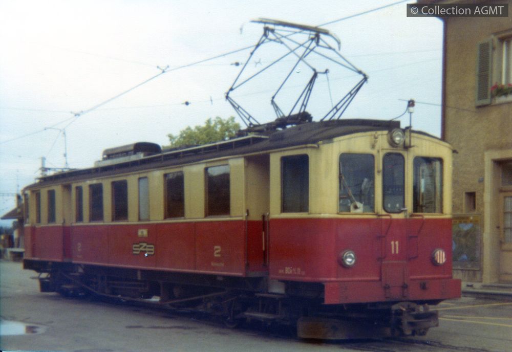 PermalinkUn convoi du BTI, formé de l'automotrice BDe 4/4 6 et d'une voiture pilote, stationne devant le dépôt de Taeuffelen / Gaston Guignard