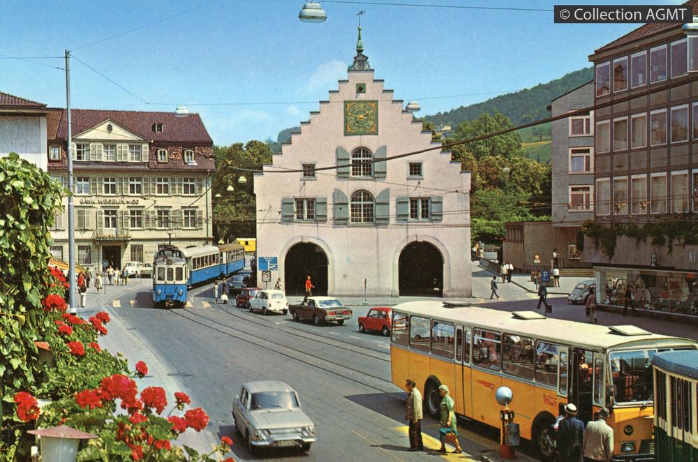 [Ligne] TrogenIndex. décimale : 4341 Chemin de fer interurbain et vicinal - véhicule - service régulier, transport de voyageur St. Gallen : Waaghaus [document graphique à deux dimensions] . - Zuerich : Photoglob-Wehrli, [ca 1970] . - 1 carte postale : couleur ; 11 x 15 cm. - (Photoglob-Wehrli; 7052) .