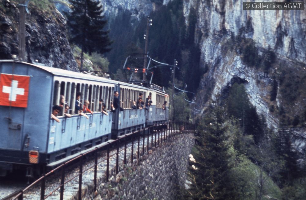 PermalinkUn convoi du LLB à destination de Loèche-les-Bains, pavoisé à l'occasion du dernier jour de circulation, s'engage dans la descente qui précède le dernier tunnel de la ligne / Werner Heubi