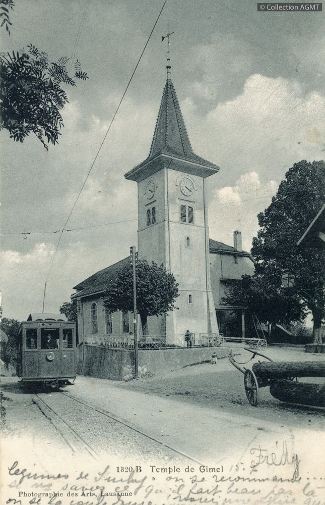 [Année] 1905Index. décimale : 4141 Tramway et métro léger interurbain et vicinal - véhicule - service régulier, transport de voyageur Temple de Gimel [document graphique à deux dimensions] . - Lausanne : Photographie des arts, [ca 1905] . - 1 carte postale : noir et blanc ; 14 x 9 cm. - (Photographie des arts; 1320 B) .