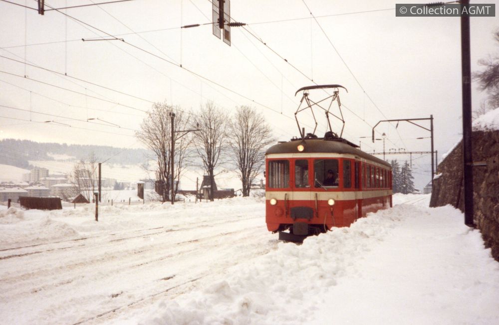 PermalinkPermalinkUne automotrice des CMN en provenance des Brenets entre dans une gare du Locle très enneigée / Gaston Guignard