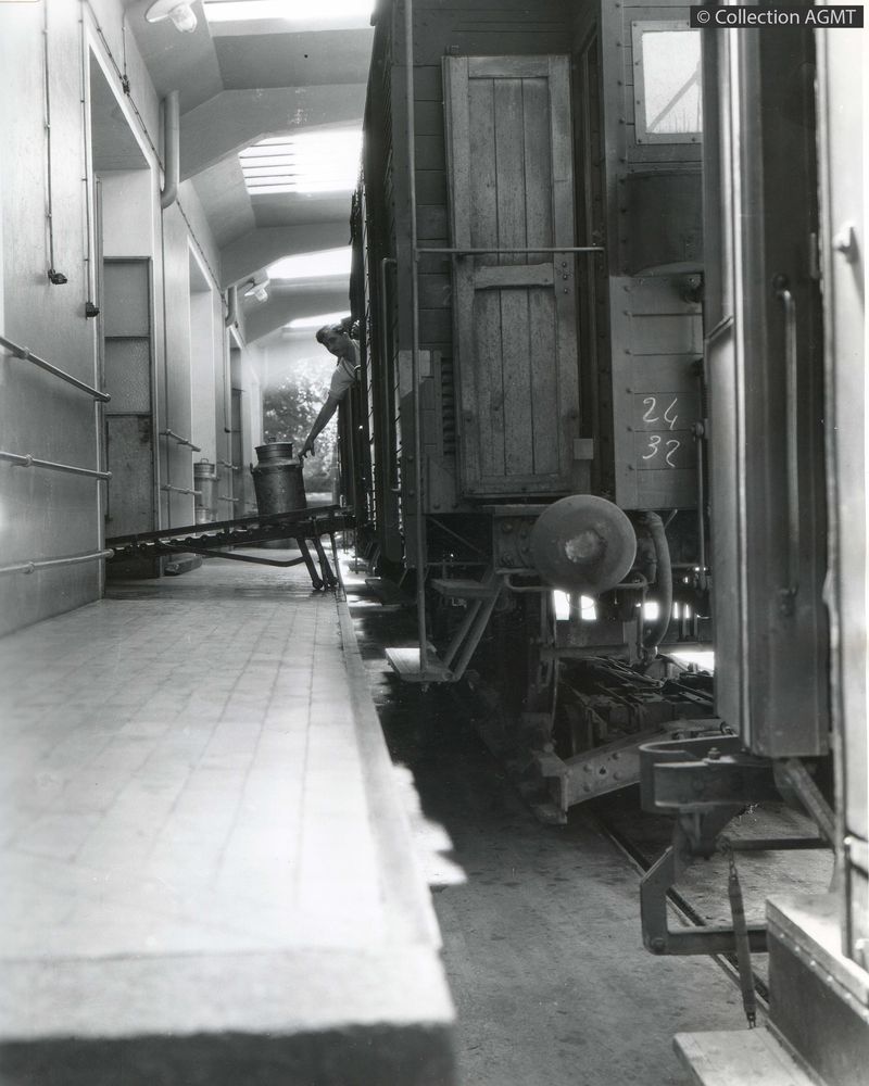 Titre : Laiteries réunies : déchargement des boilles de lait d'un wagon couvert CFF chargé sur un cadre porteur CGTE Type de document : document graphique à deux dimensions Auteurs : Compagnie genevoise des tramways électriques, Photographe Editeur : [S.l.] : [s.n.] Année de publication : [ca 1934] Importance : 1 photographie Présentation : noir et blanc Format : 23 x 18 cm Note générale : Photo publiée dans le Bulletin CGTE, an 4, no 4(1934), p. 16 Langues : Français (fre) Catégories : [Mots-clefs] 647-656