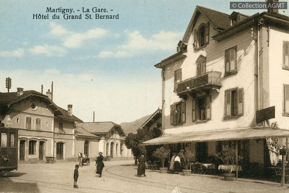[Ligne] Martigny-GareIndex. décimale : 3141 Tramway et métro léger urbain - véhicule - service régulier, transport de voyageur Martigny : la Gare, Hôtel du Grand St. Bernard [document graphique à deux dimensions] . - Lausanne : Ed. d'art R.E. Chapallaz fils, [ca 1918] . - 1 carte postale : colorisée ; 9 x 14 cm. - (Seal) .