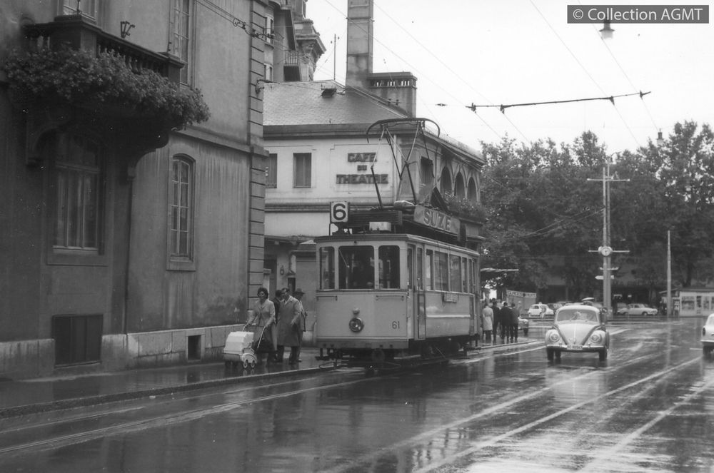 Neuchâtel : circulant sur la ligne 6 en direction de la Gare, l'automotrice 61 passe à la rue de l'Hôtel-de-Ville |