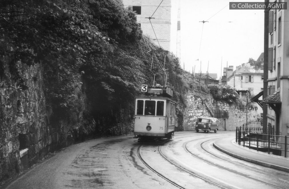 Neuchâtel : l'automotrice 75, circulant sur la ligne 3 en direction de Corcelles, monte la rue de l'Ecluse |
