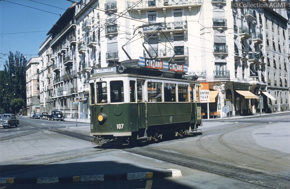 PermalinkSur le chemin du dépôt, l'automotrice 107 venant du Boulevard St-Georges traverse le rond-point de la Jonction / Peter Willen