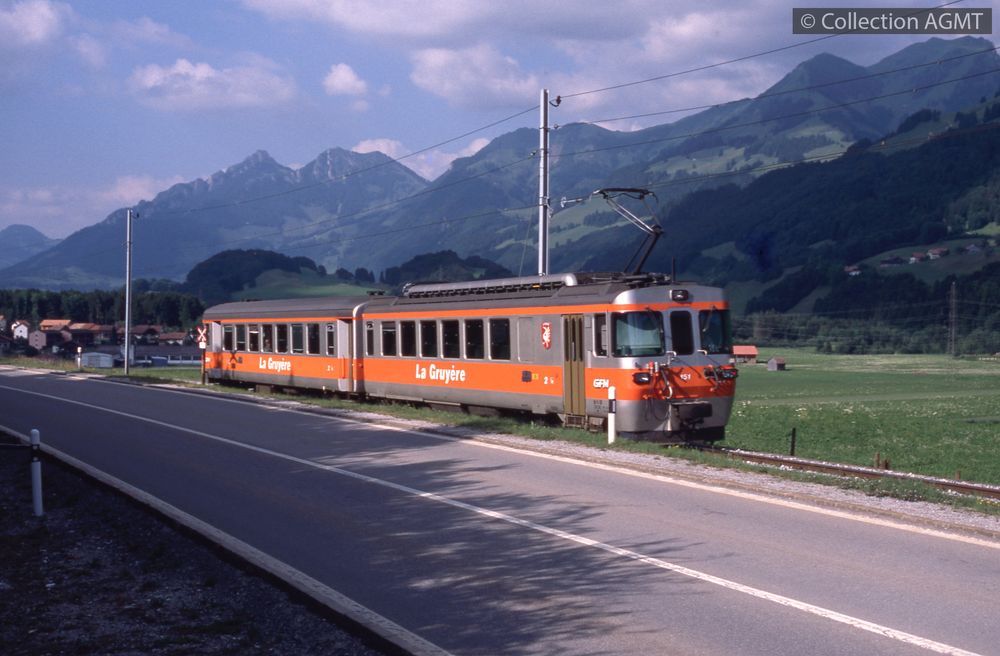 4341(494.41)_GFM_1989-01_d.jpgImage JpegUne rame réversible des GFM à destination de Bulle, formée de l'automotrice 151 et de la voiture-pilote 254, circule en accotement routier à proximité de Lessoc / Jeremy Wiseman