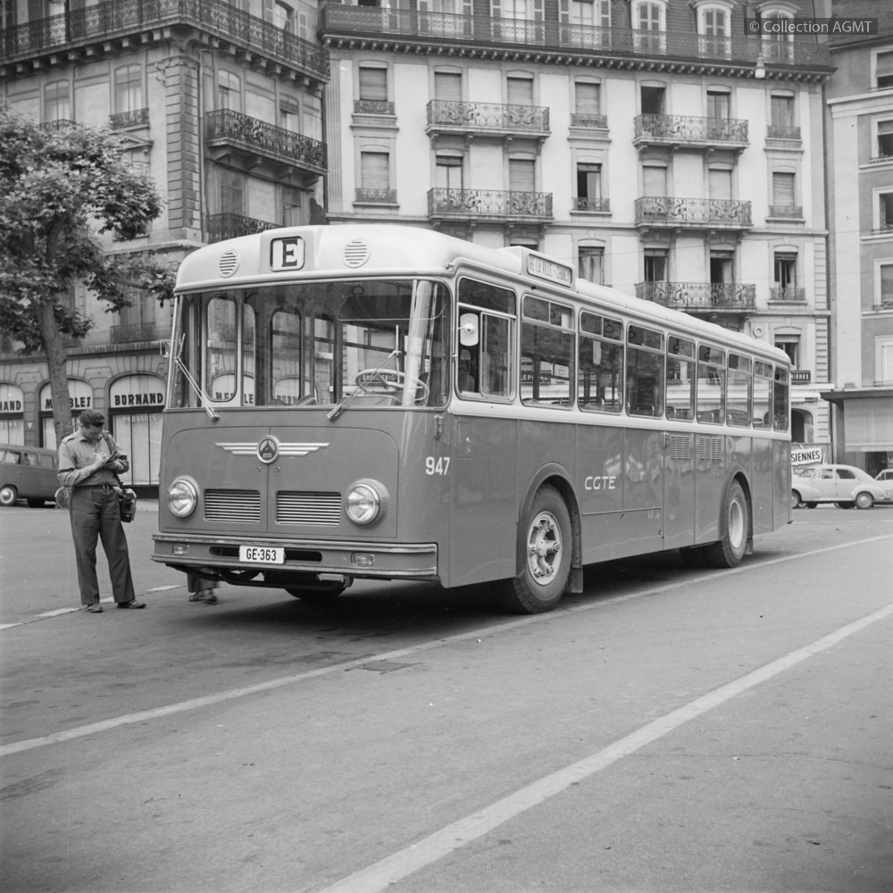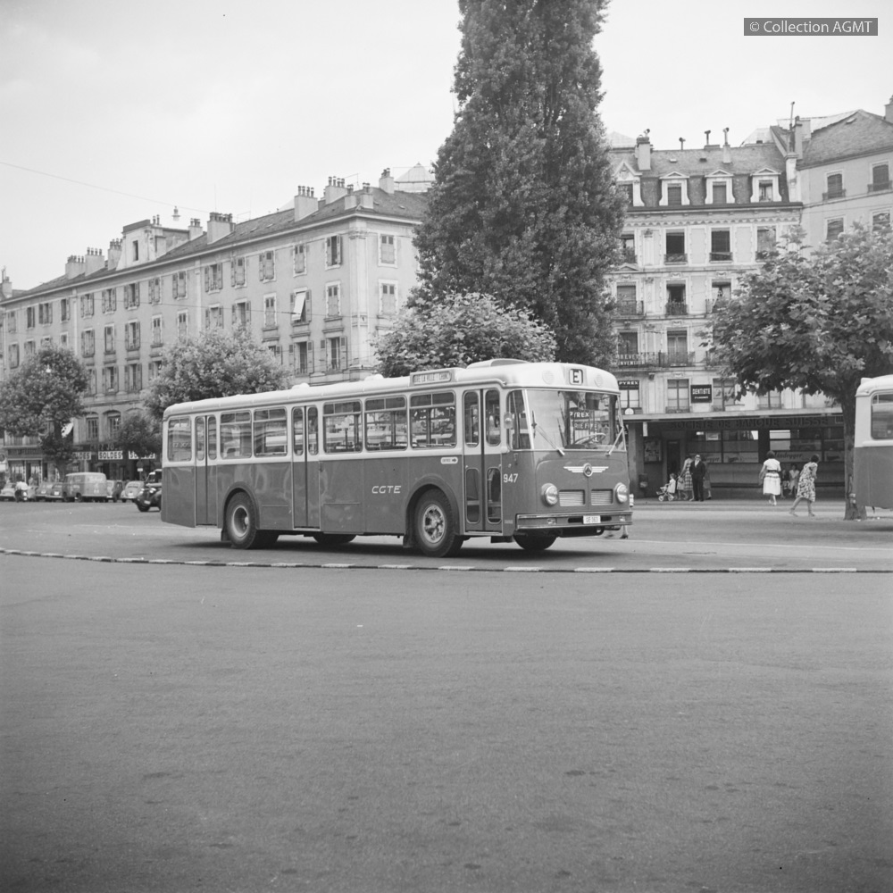 [Année] 1958Index. décimale : 4441 Bus interurbain et vicinal - véhicule - service régulier, transport de voyageur Genève, rond-point de Rive : le "Diwabus" no 947 de la CGTE, en service sur la ligne E, attend l'heure du départ pour Chancy [document graphique à deux dimensions] / Willy Boegli (1916-1994), Photographe . - [Petit-Lancy : M. Kohler], [2016] . - 1 photo : noir et blanc ; 11 x 11 cm.