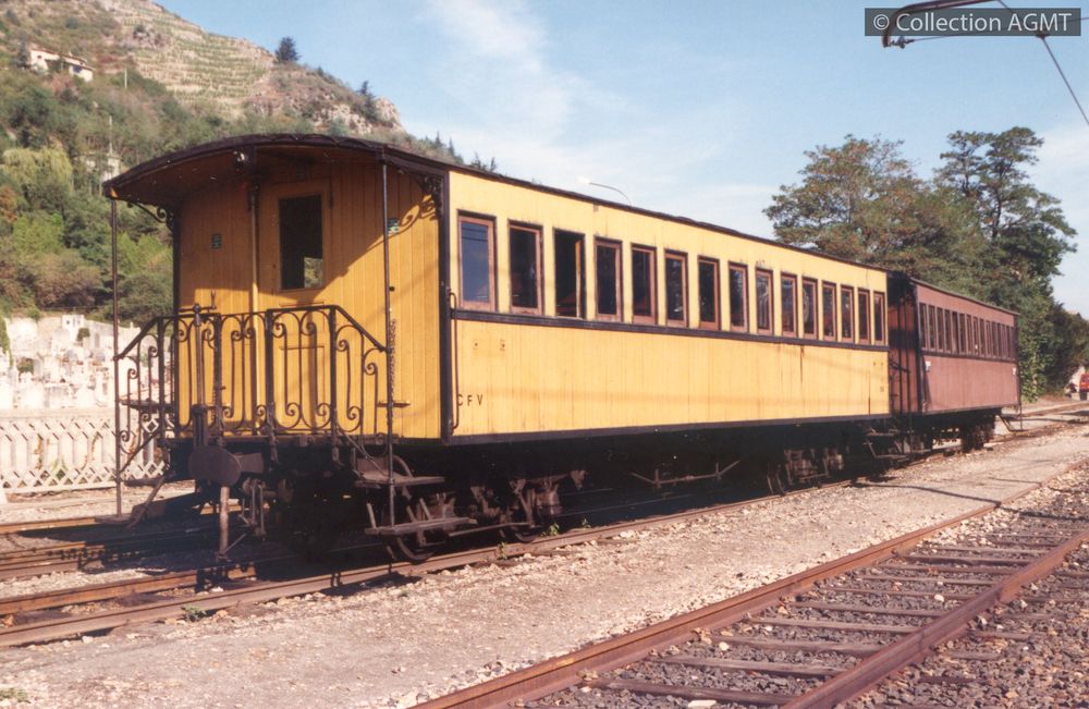 Affiner la recherche Interroger des sources externesCédée aux CFV, la voiture AB4i 93 du MOB, encore en livrée d'origine, stationne sur une voie du dépôt de Tournon / Gaston Guignard