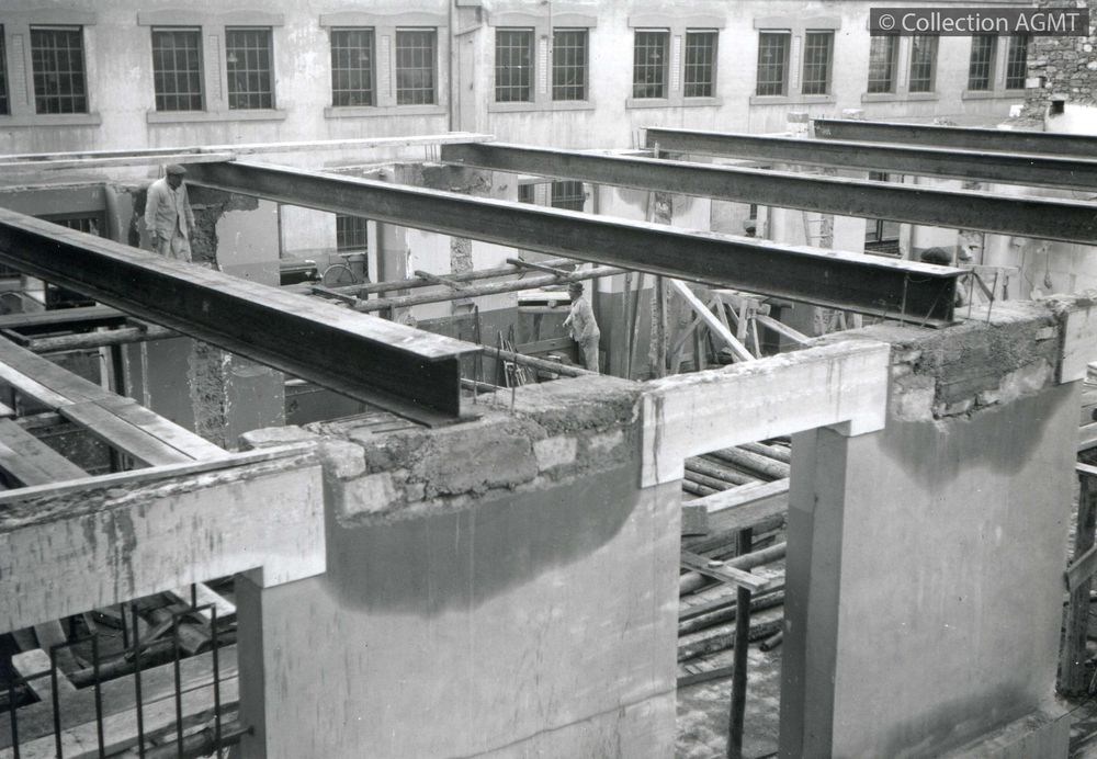 [Année] 1949Index. décimale : 3032 Transport public urbain - autres installations fixes (bâtiments, gares, dépôts, ateliers, ...) - construction, mise en service, inauguration Les poutres métalliques destinées à soutenir le nouvel étage de l'aile côté rue de la Truite du bâtiment administratif sont posées sur le faîte des anciens murs du rez-de-chaussée [document graphique à deux dimensions] / Compagnie genevoise des tramways électriques, Photographe . - [S.l.] : [s.n.], [2001] . - 1 photo : noir et blanc ; 11 x 15 cm + 1 négatif (6 x 9 cm.) pour tirage noir et blanc.
