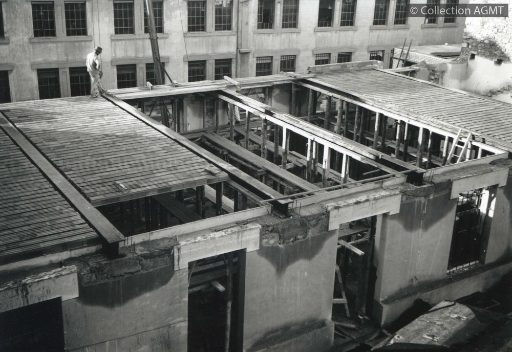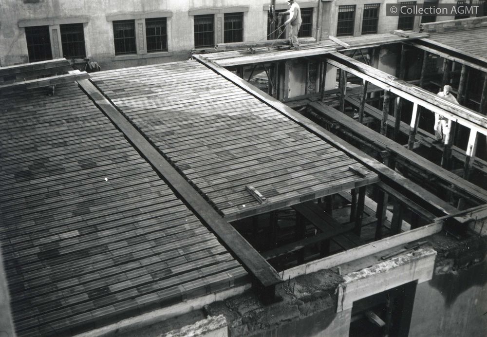 PermalinkVue plongeante sur le nouveau plancher du 1er étage de l'aile côté rue de la Truite du bâtiment administratif du dépôt de la Jonction / Compagnie genevoise des tramways électriques