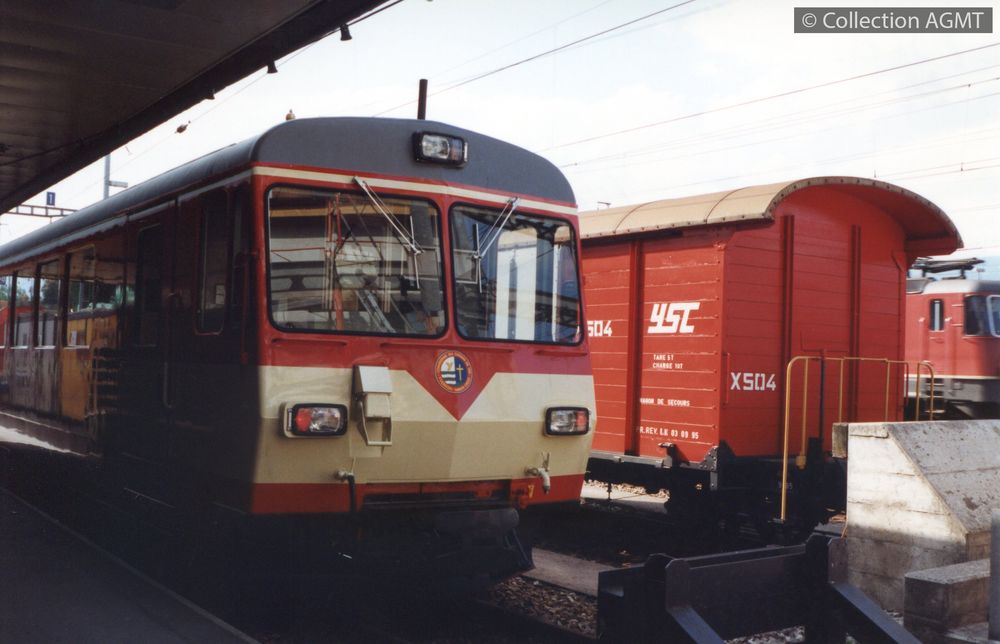 4345(494.45)_YSteC_1992-01.jpgImage JpegGros plan sur l'avant de la voiture pilote Bt4 53 de l'YSteC stationnée en gare d'Yverdon à côté du wagon de secours X2 504 / Gaston Guignard