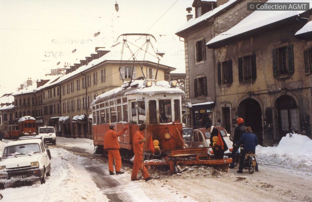 [Année] 1985Index. décimale : 3144 Tramway et métro léger urbain - véhicule - service des travaux, de la voie La couche de neige qui recouvre les voies de la rue Ancienne donne du fil à retordre à la râcleuse poussée par le Xe 4/4 70 [document graphique à deux dimensions] / Eric Rahm, Photographe . - Genève : Association genevoise du musée des tramways. Service photos, [ca 1985] . - 1 photo : couleur ; 9 x 13 cm.