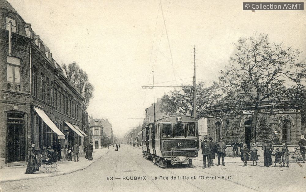 [Compagnie] TELBIndex. décimale : 3141 Tramway et métro léger urbain - véhicule - service régulier, transport de voyageur Roubaix : la rue de Lille et l'Octroi [document graphique à deux dimensions] . - [S.l.] : EC, [ca 1910] . - 1 photographie : noir et blanc ; 9 x 14 cm. - (EC; 53) .