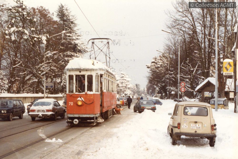 Circulation anarchique à la route de Chêne : le Xe 4/4 70 et sa râcleuse se font dépasser par des voitures qui circulent sur les voies de tram, mieux dégagées que la route [document graphique à deux dimensions] / Eric Rahm, Photographe . - Genève : Association genevoise du musée des tramways. Service photos, [ca 1985] . - 1 photo : couleur ; 9 x 13 cm. Langues : Français (fre)
