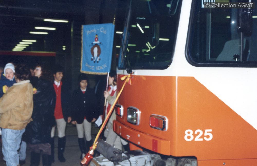 [Année] 1989Résumé : "Le jeudi 6 avril, la motrice 828 a été baptisée aux armes de Veyrier. En préalable à cette cérémonie, l'AGMT avait présenté trois exposés sur l'histoire des tramways, et plus particulièrement du Genève-Veyrier, dans diverses classes de la commune. Le convoi historique a, de plus, roulé le jour du baptême avec des cibles ""8"" entre le dépôt et la boucle du Bachet pour les habitants de la commune."