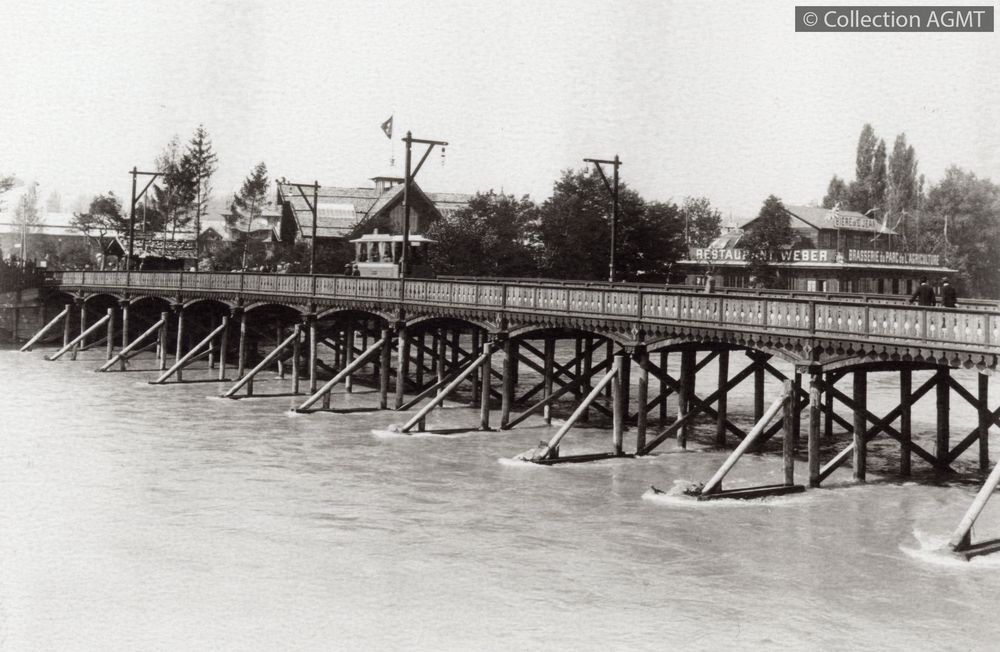 Se dirigeant vers le Parc de l'agriculture, une automotrice du tramway intérieur de l'Exposition nationale suisse de 1896 franchit un pont provisoire sur l'Arve [document graphique à deux dimensions] . - [1996] . - 1 photo : noir et blanc ; 15 x 20 cm. Langues : Français ( fre) |  |