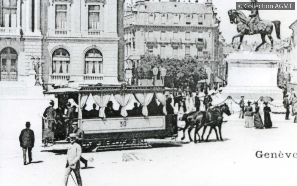 Vue latérale du tram hippomobile no 30 des TS à la place Neuve au pied de la statue du général Dufour |