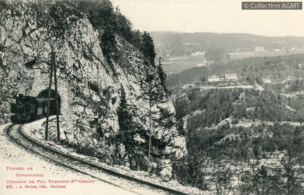 [Année] 1900Index. décimale : 4341 Chemin de fer interurbain et vicinal - véhicule - service régulier, transport de voyageur Tunnel de Covatannaz (Chemin de fer Yverdon-Ste-Croix) [document graphique à deux dimensions] . - Baulmes : A. Deriaz, [ca 1900] . - 1 carte postale : noir et blanc ; 9 x 14 cm. - (A. Deriaz; 436) .