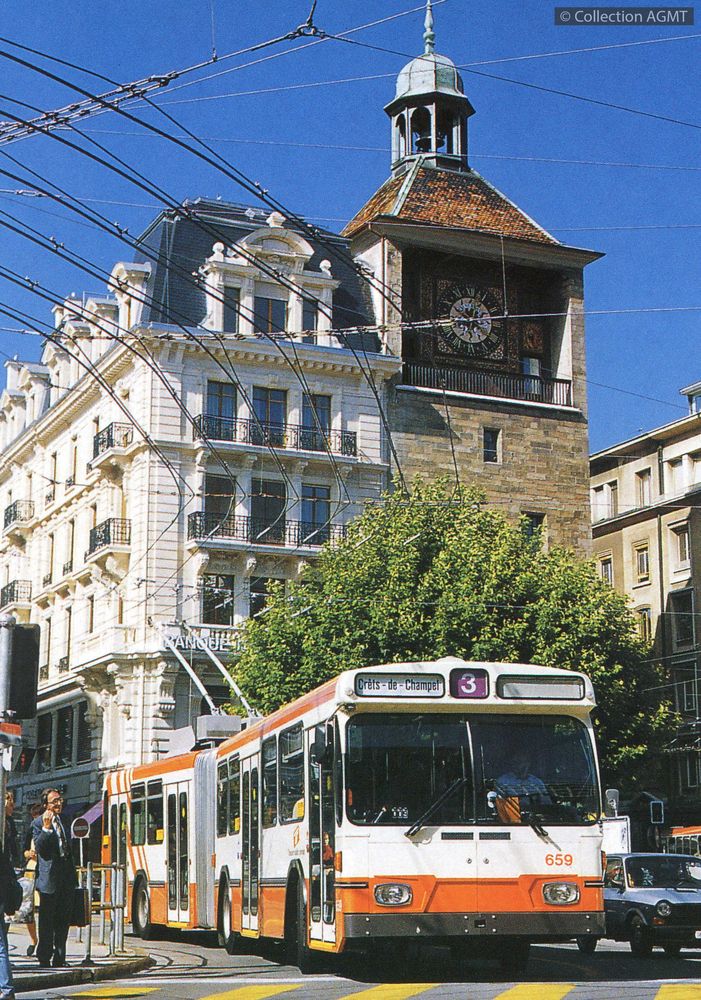 [Ligne] Ligne 3Index. décimale : 3541 Trolleybus, gyrobus, véhicule bi-mode urbain - véhicule - service régulier, transport de voyageur Genève : Saurer/Hess/BBCSE GT 560/620-25 Gelenktrolleybus Nr. 659 (1982), Transports publics genevois TPG, auf der Place Bel-Air vor der Tour-de-l'Ile [document graphique à deux dimensions] / Andreas Wittwer, Photographe . - Coire : Andreas Wittwer, 1997 . - 1 photo : couleur ; 15 x 11 cm.