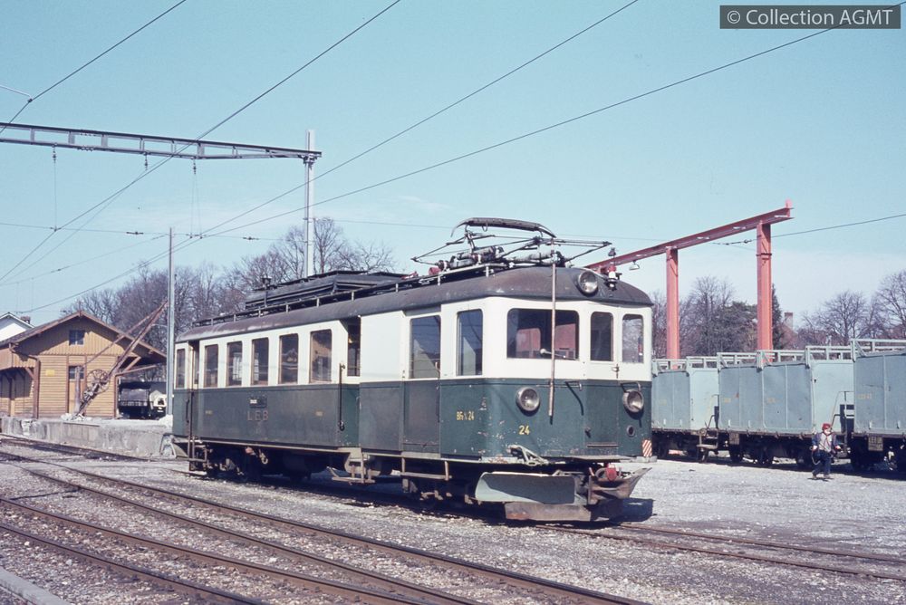 [Compagnie] LEB (Lausanne)Index. décimale : 4341 Chemin de fer interurbain et vicinal - véhicule - service régulier, transport de voyageur L'automotrice BFe 4/4 24 du LEB stationne sur la voie du quai marchandises de la gare d'Echallens [document projeté ou vidéo] / Jeremy Wiseman (1933-2022), Photographe . - [S.l.] : 3M, [ca 1971] . - 1 diapositive : couleur ; 5 x 5 cm.