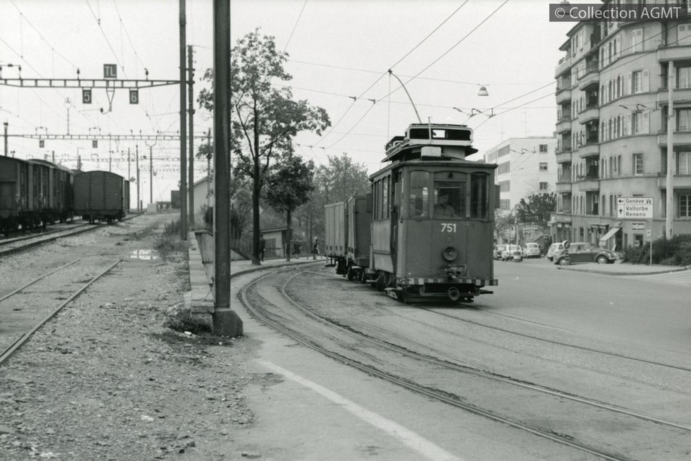 PermalinkPermalinkVue arrière d'un convoi du LEB, formé du tracteur 751 et de deux wagons porte-conteneurs, qui quitte Sébeillon pour Chauderon / Jeremy Wiseman