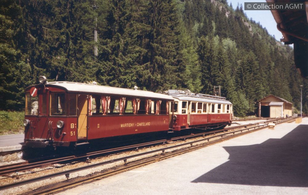 4349(494.44)_MC_1981-13.jpgImage JpegLors des festivités du 75e anniversaire de la ligne, un convoi formé de l'automotrice ABDeh 4/4 14 et de la voiture pilote Bt4 51 du MC stationne en gare du Châtelard-Frontière / Gaston Guignard