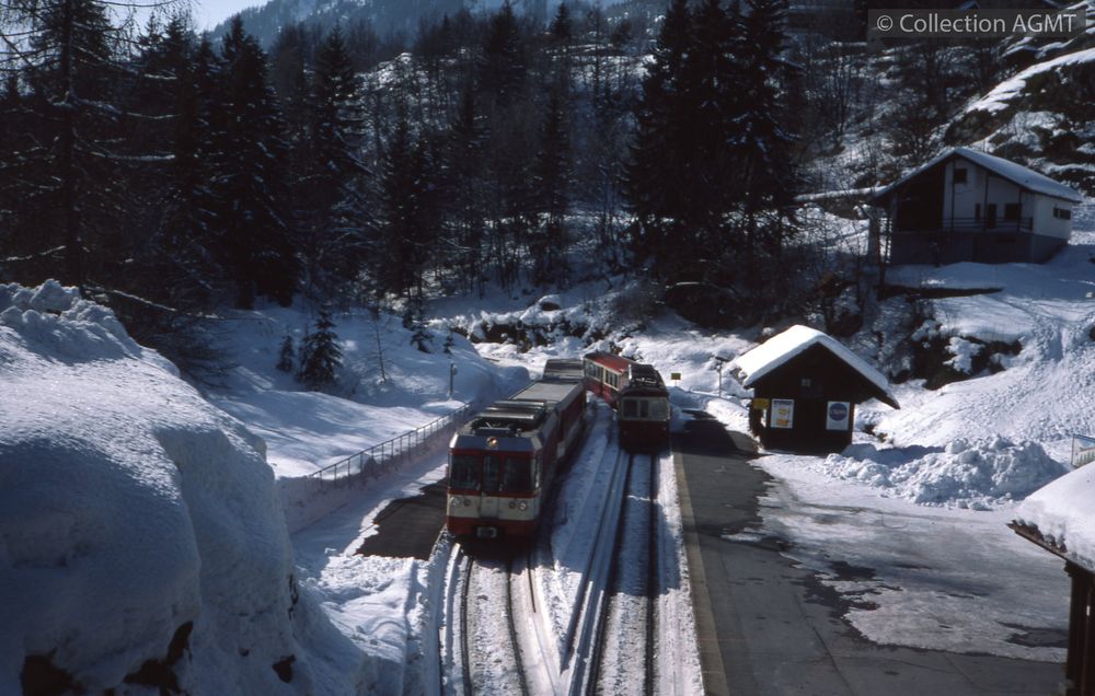 PermalinkVoiture pilote ABDt4 65 en tête, un convoi du MC à destination du Châtelard marque l'arrêt aux Marécottes / Gaston Guignard