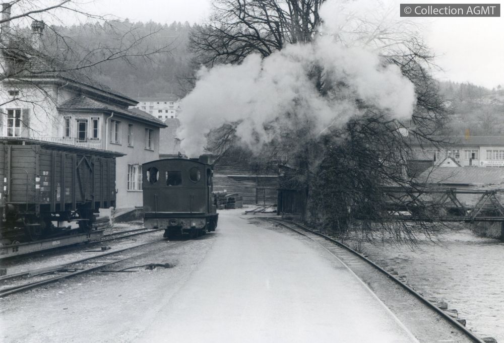 PermalinkPermalinkRemorquant un wagon couvert, le tracteur à accumulateurs des VDW passe à la hauteur de la voie d'accès à la scierie Renfer à Boujan / Jeremy Wiseman