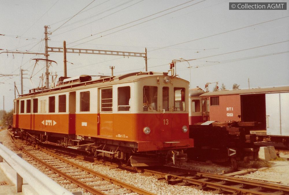 Une automotrice Be 2/6 du BTI, récemment mise en service, stationne sur une voie de garage du dépôt de Taeuffelen avec le wagon couvert G 584 |