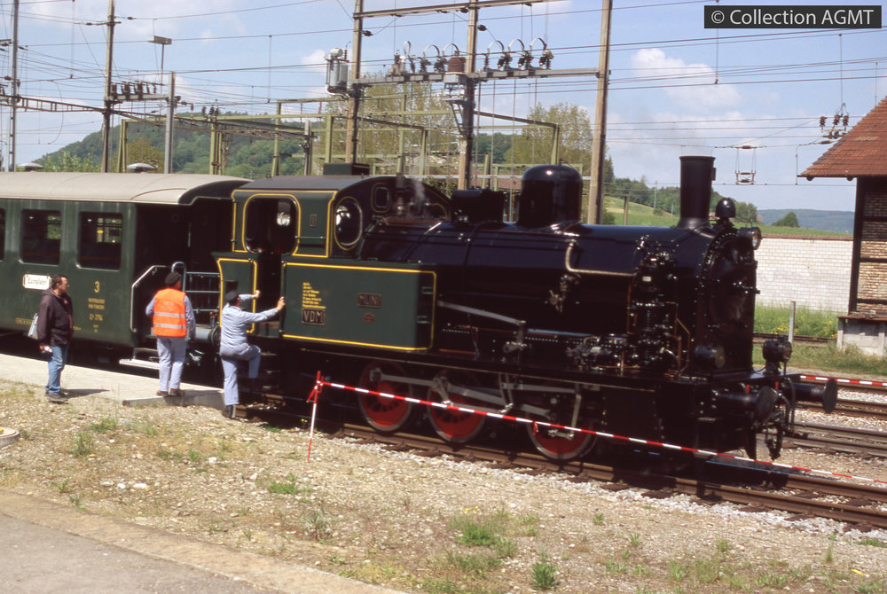 [Compagnie] VDMIndex. décimale : 4348 Chemin de fer interurbain et vicinal - véhicule - préservé, en service historique En tête de son convoi, la locomotive à vapeur Ed 3/3 "Muni" du VDM attend, en gare d'Etzwilen, l'heure du départ pour Singen [document projeté ou vidéo] / Jeremy Wiseman (1933-2022), Photographe . - [S.l.] : [s.n.], 2004 . - 1 diapositive : couleur ; 5 x 5 cm.