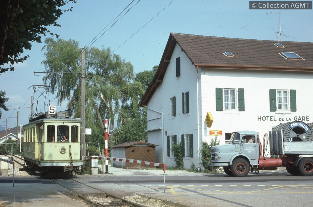 4141(494.43)_TN_1984-09_d.jpgImage JpegEn service sur la navette de la ligne 5 Areuse - Cortaillod, l'automotrice 46 des TN franchit un passage à niveau à l'entrée de la gare de Cortaillod / Jeremy Wiseman