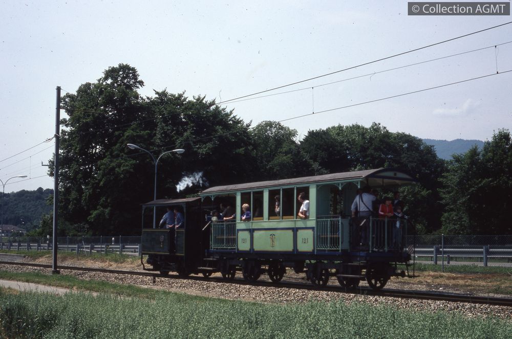 [Compagnie] TN (Neuchâtel)Index. décimale : 4149 Tramway et métro léger interurbain et vicinal - véhicule - services spéciaux (film, dépannage, exposition, service supplémentaire, transports spéciaux, baptême, inauguration, etc.) Lors des festivités du Littorail, un convoi formé d'une locomotive à vapeur ex-Ferrovie Padane, préservée par le BC, et de la remorque 121 des TN, ex-NCB, approche d'Areuse venant de Colombiers [document projeté ou vidéo] / Jeremy Wiseman (1933-2022), Photographe . - [S.l.] : Kodak, 1981 . - 1 diapositive : couleur ; 5 x 5 cm.
