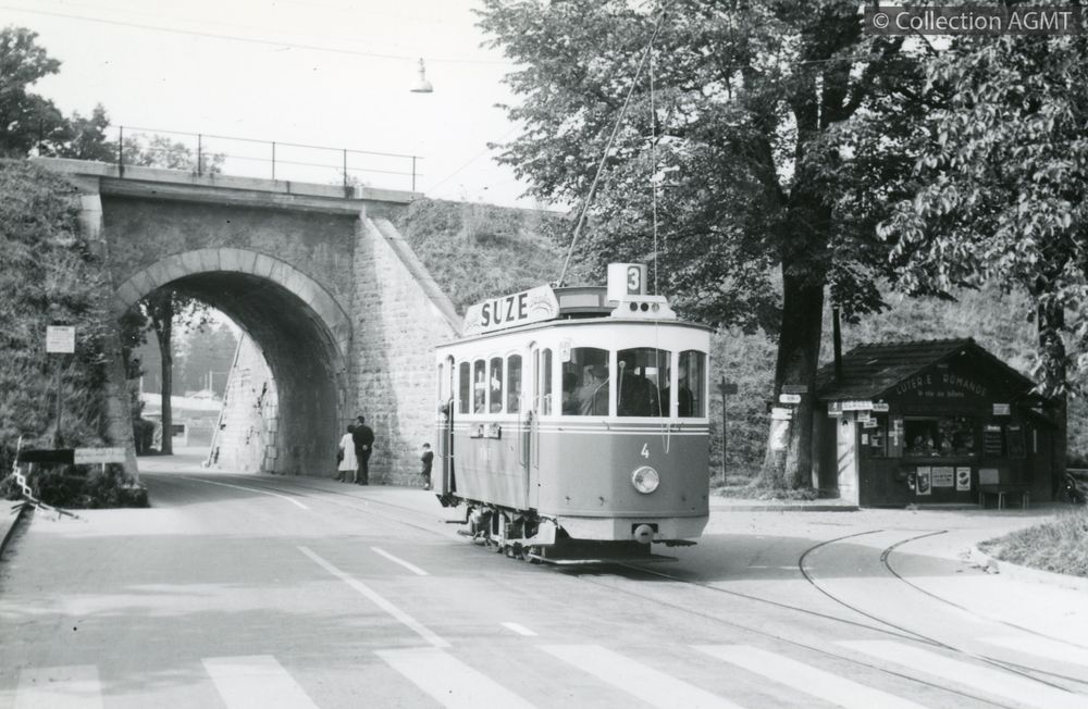 PermalinkEn service sur la ligne 3 à destination du cimetière, l'automotrice 13 des TF s'engage dans le passage sous les voies CFF du chemin St-Léonard / Richard J.S. Wiseman