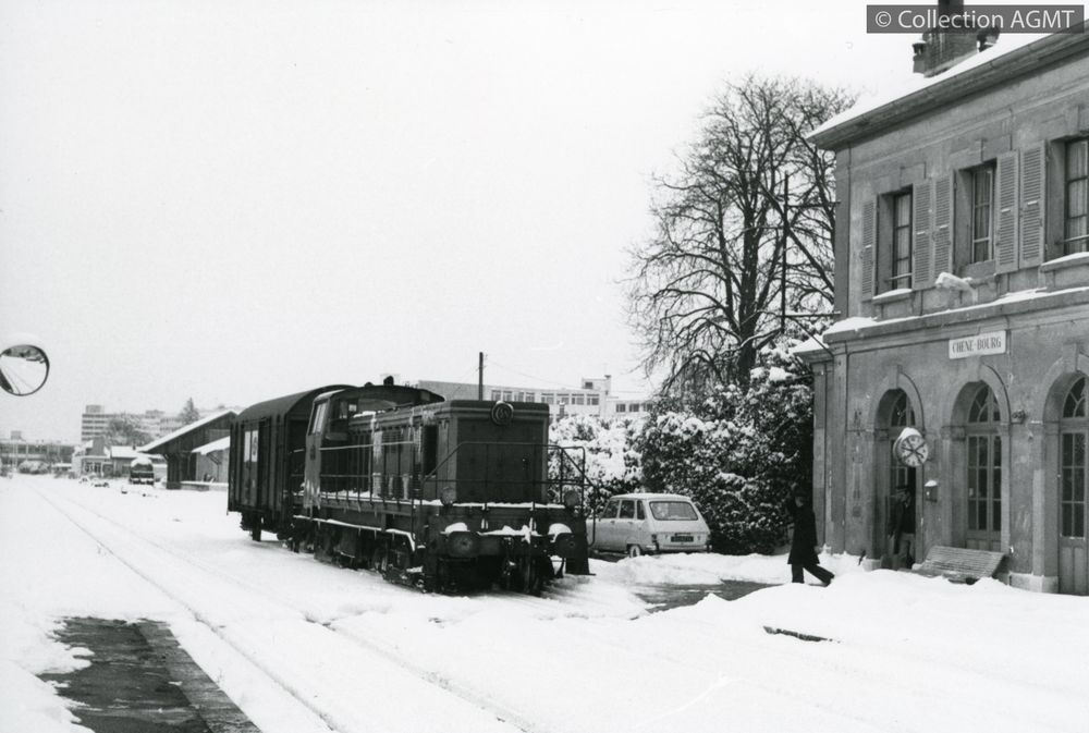 4345(494.42)_SNCF_1979-01.jpgImage JpegUn train de marchandises SNCF, formé d'une BB 63000 et d'un wagon couvert, stationne dans la neige en gare de Chêne-Bourg / Jeremy Wiseman