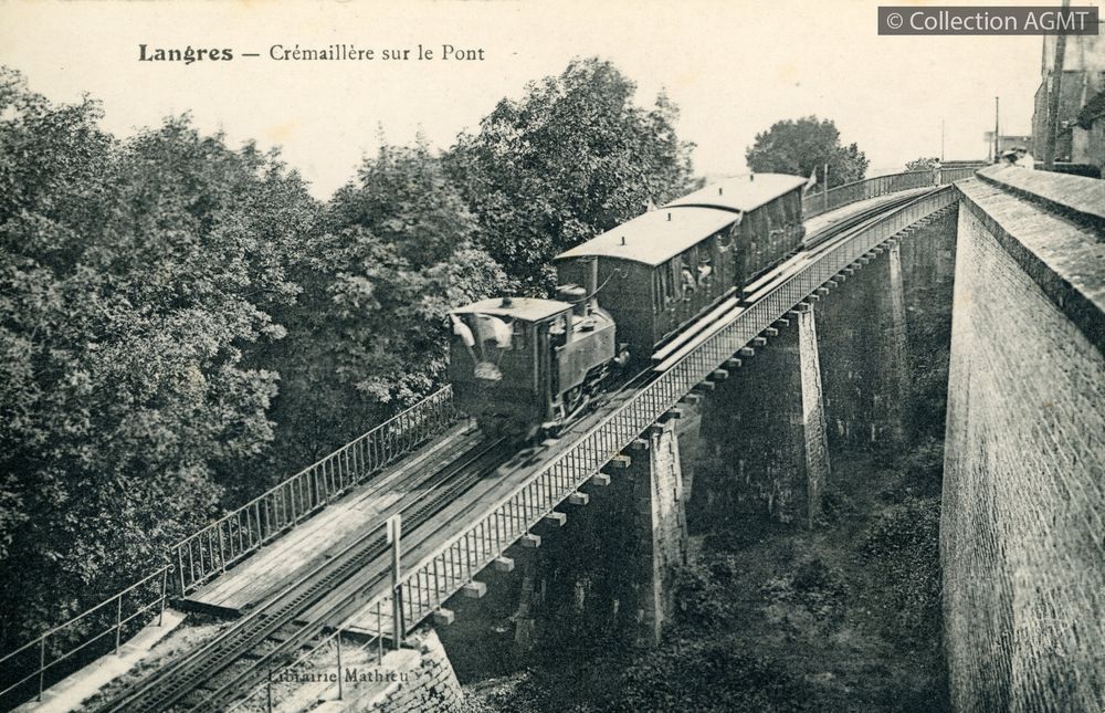 [Ligne] Langres-MarneIndex. décimale : 4341 Chemin de fer interurbain et vicinal - véhicule - service régulier, transport de voyageur Langres : crémaillère sur le pont [document graphique à deux dimensions] . - [S.l.] : Librairie Mathieu, [ca 1910] . - 1 carte postale : noir et blanc ; 9 x 14 cm.