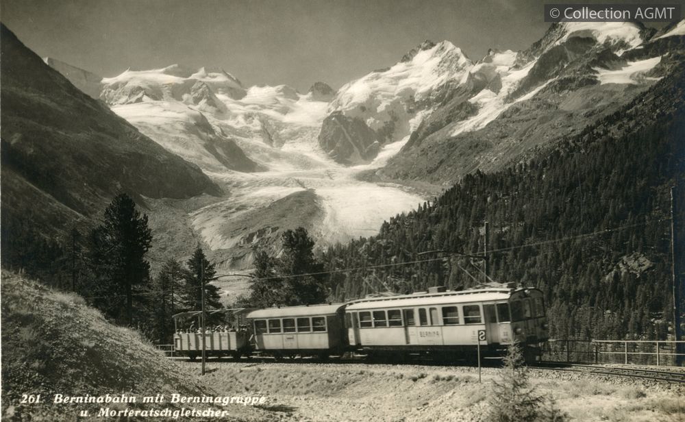 [Compagnie] BB (Grisons)Index. décimale : 4341 Chemin de fer interurbain et vicinal - véhicule - service régulier, transport de voyageur Berninabahn mit Berninagruppe u. Morteratschgletscher [document graphique à deux dimensions] / B. Schocher, Photographe . - Pontresina : Phot. B. Schocher, [ca 1930] . - 1 carte postale : noir et blanc ; 9 x 14 cm. - (B. Schocher; 261) .