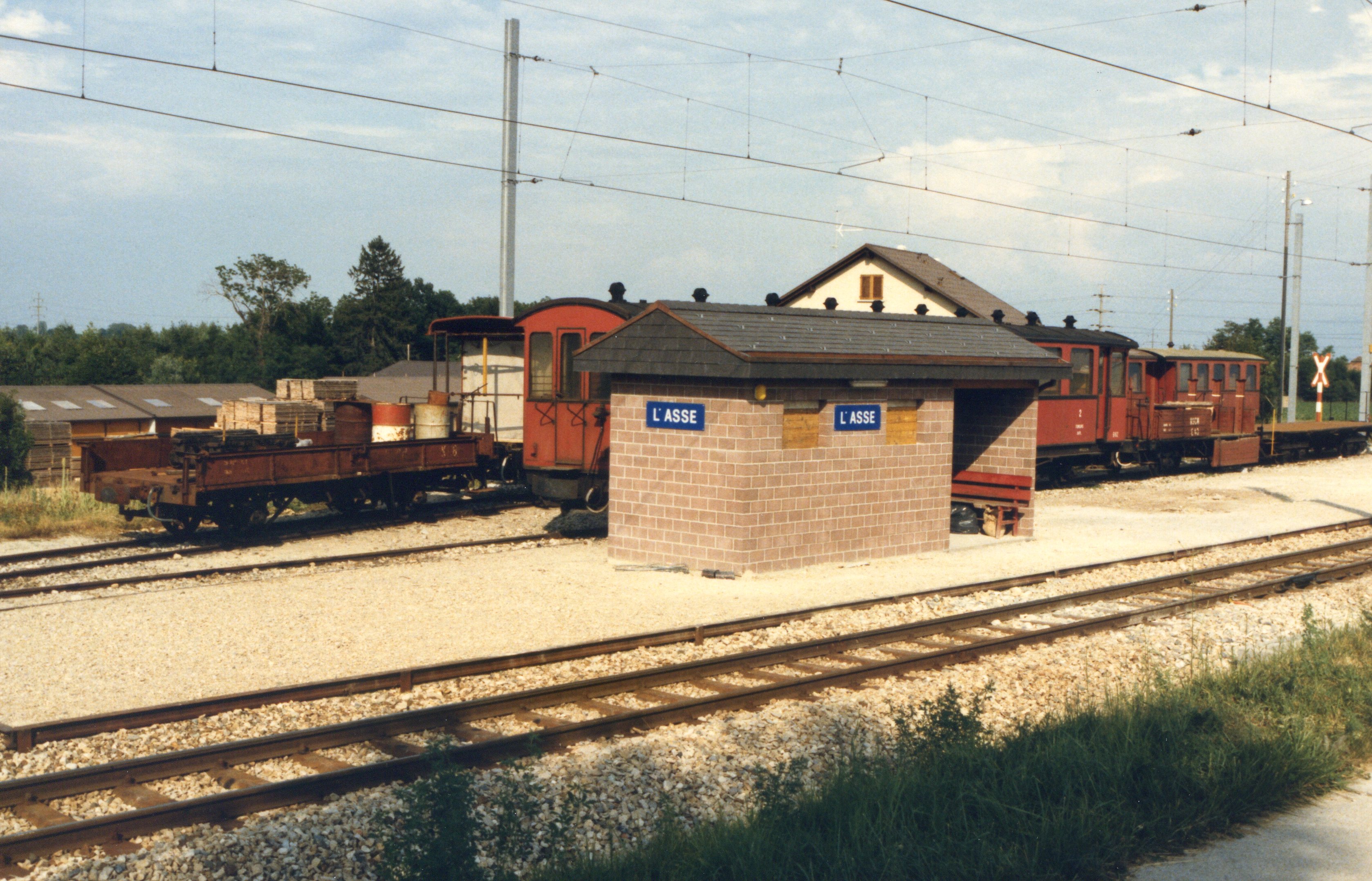 [Mots-clefs] B4 [Mots-clefs] Bâtiment [Mots-clefs] Chemin de fer privé [Mots-clefs] Gare [Mots-clefs] Infrastructure [Mots-clefs] L'Asse (gare) [Mots-clefs] Plan de voie [Mots-clefs] Suisse [Mots-clefs] Vaud [Mots-clefs] Voie [Mots-clefs] Voiture [Mots-clefs] Wagon à bords bas [Mots-clefs] Wagon plat [Année] 1986 [Compagnie] NStCM [Ligne] 155