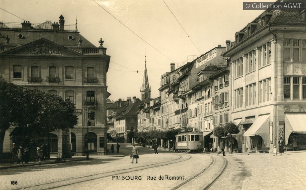 [Année] 1920Index. décimale : 3141 Tramway et métro léger urbain - véhicule - service régulier, transport de voyageur Fribourg : rue de Romont [document graphique à deux dimensions] . - Lausanne : Edition art. Perrochet-Matile, [ca 1920] . - 1 carte postale : noir et blanc ; 9 x 14 cm. - (Perrochet-Matile; 186) .