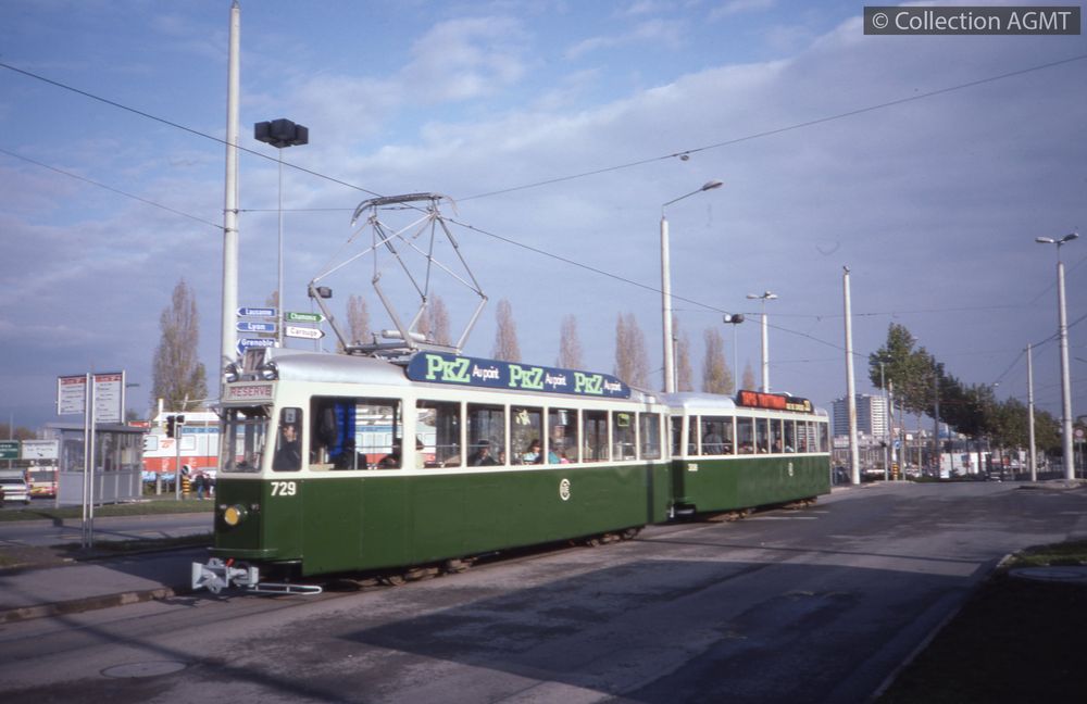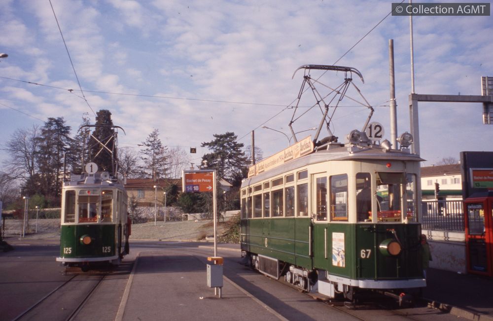 PermalinkLe convoi AGMT, formé de l'automotrice 729 et de la remorque 363, stationne au Bachet à côté de l'automotrice 846 des TPG en service sur la ligne 12 / François Chapuis