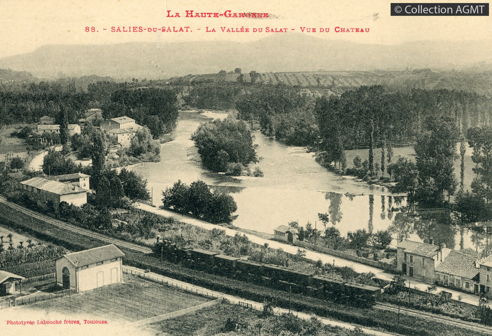 [Ligne] St-GironsIndex. décimale : 4341 Chemin de fer interurbain et vicinal - véhicule - service régulier, transport de voyageur La Haute-Garonne. Salies-du-Salat : la vallée du Salat, vue du château [document graphique à deux dimensions] . - Toulouse : Phototypie Labouche frères, [ca 1910] . - 1 carte postale : noir et blanc ; 9 x 14 cm. - (Labouche frères; 88) .