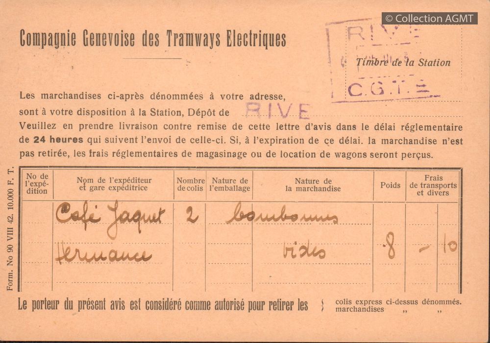 [Avis de disponibilité de marchandises en station] [texte imprimé] / Compagnie genevoise des tramways électriques, Auteur . - Genève : CGTE, [1925] . - [2] p. : tabl. ; 11 x 15 cm. Langues : Français (fre)