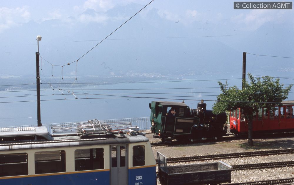 [Compagnie] MVRIndex. décimale : 4341 Chemin de fer interurbain et vicinal - véhicule - service régulier, transport de voyageur L'automotrice Bhe 2/4 208 du MVR stationne sur une voie de garage de la gare de Glion où le train à vapeur est prêt à se mettre à quai [document projeté ou vidéo] / Jeremy Wiseman (1933-2022), Photographe . - [S.l.] : [s.n.], 2004 . - 1 diapositive : couleur ; 5 x 5 cm.