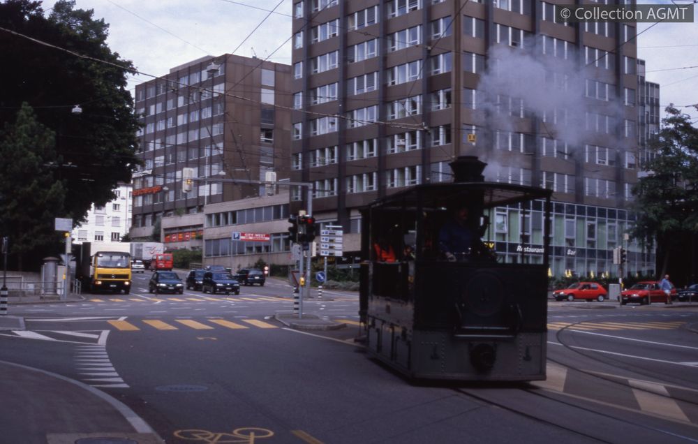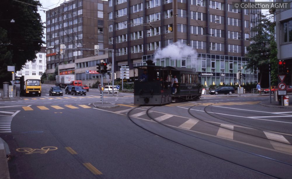 [Compagnie] VHSIndex. décimale : 3149 Tramway et métro léger urbain - véhicule - services spéciaux (film, dépannage, exposition, service supplémentaire, transports spéciaux, baptême, inauguration, etc.) Gros plan sur la locomotive à vapeur G 3/3, ex-BTG, qui s'engage dans la Belpstrasse en venant de l'Effingerstrasse [document projeté ou vidéo] / Jeremy Wiseman (1933-2022), Photographe . - [S.l.] : [s.n.], 2000 . - 1 diapositive : couleur ; 5 x 5 cm.