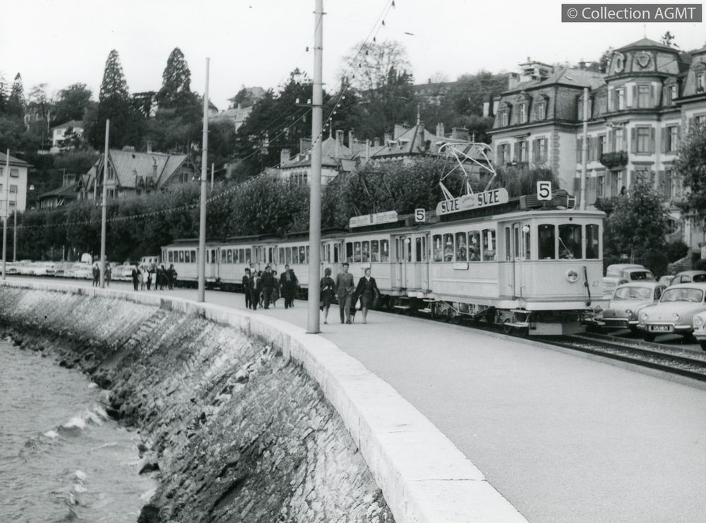 Code-barres Cote Support Localisation Section Disponibilité 6700014627 4141(494.43) TN 1960/05 Photographie Bachet Photographies Disponible PermalinkPermalinkEn ce jour de Fête des vendanges, un long convoi de la ligne 5 des TN formé de deux automotrices série 41-47 et de trois remorques série 111-114 circule au quai Philippe-Godet / Jeremy Wiseman