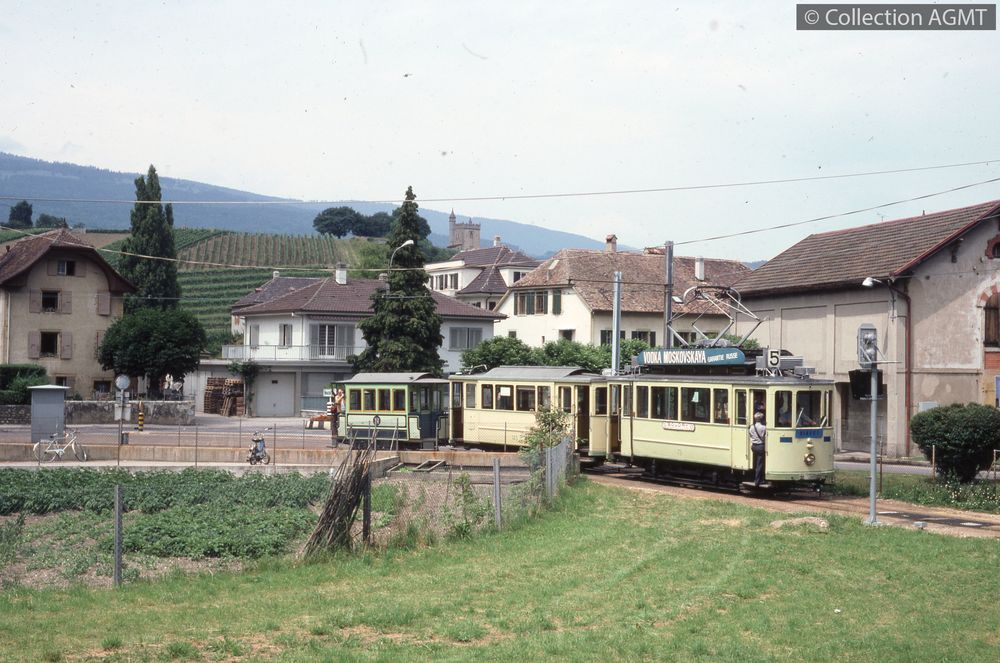 Assurant une course spéciale lors des festivités du Littorail, le convoi ANAT formé de l'automotrice 73 et des remorques 143 et 1 circule en direction de Boudry à proximité de Colombier |